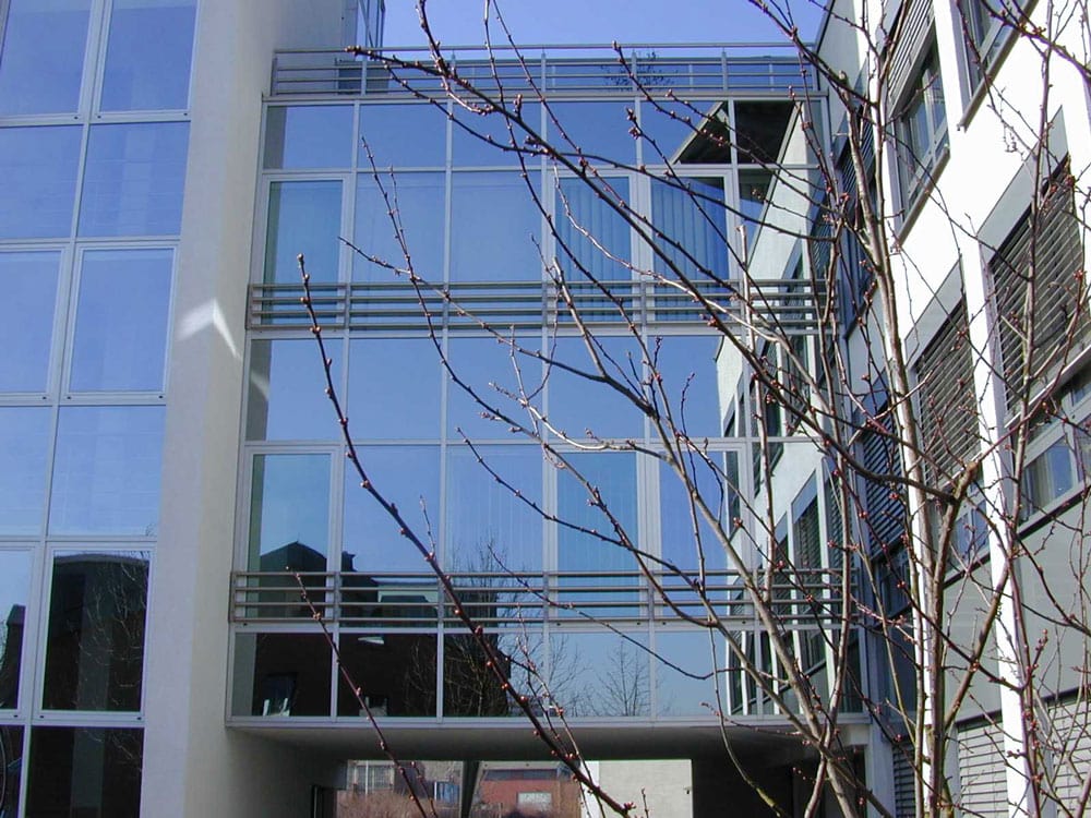 An das bestehende Bürogebäude der Conet AG wurde ein 4 geschossiger Erweiterungsbau geplant und realisiert. Eoin verglaste Verbindungsbrücke, ein halb runder voll verglaster Turm bilden die gelungene Anbindung an den Gebäudebestand.